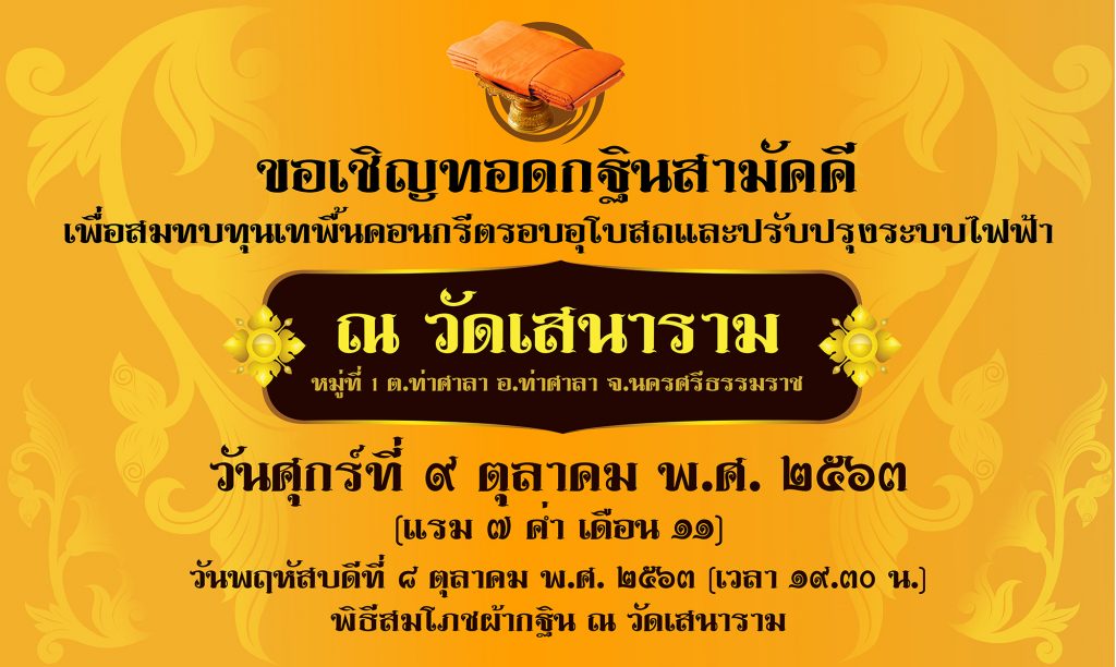 ขอเชิญร่วมทอดกฐินสามัคคีประจำปี พ.ศ.๒๕๖๓ ณ วัดเสนาราม Read More »