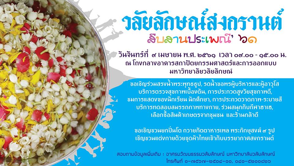 ขอเชิญร่วมงานวลัยลักษณ์สงกรานต์สืบสานประเพณี ประจำปี พ.ศ.๒๕๖๑ Read More »