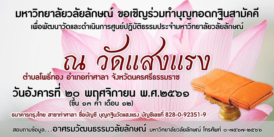 ขอเชิญร่วมทำบุญทอดกฐินสามัคคีวัดแสงแรง