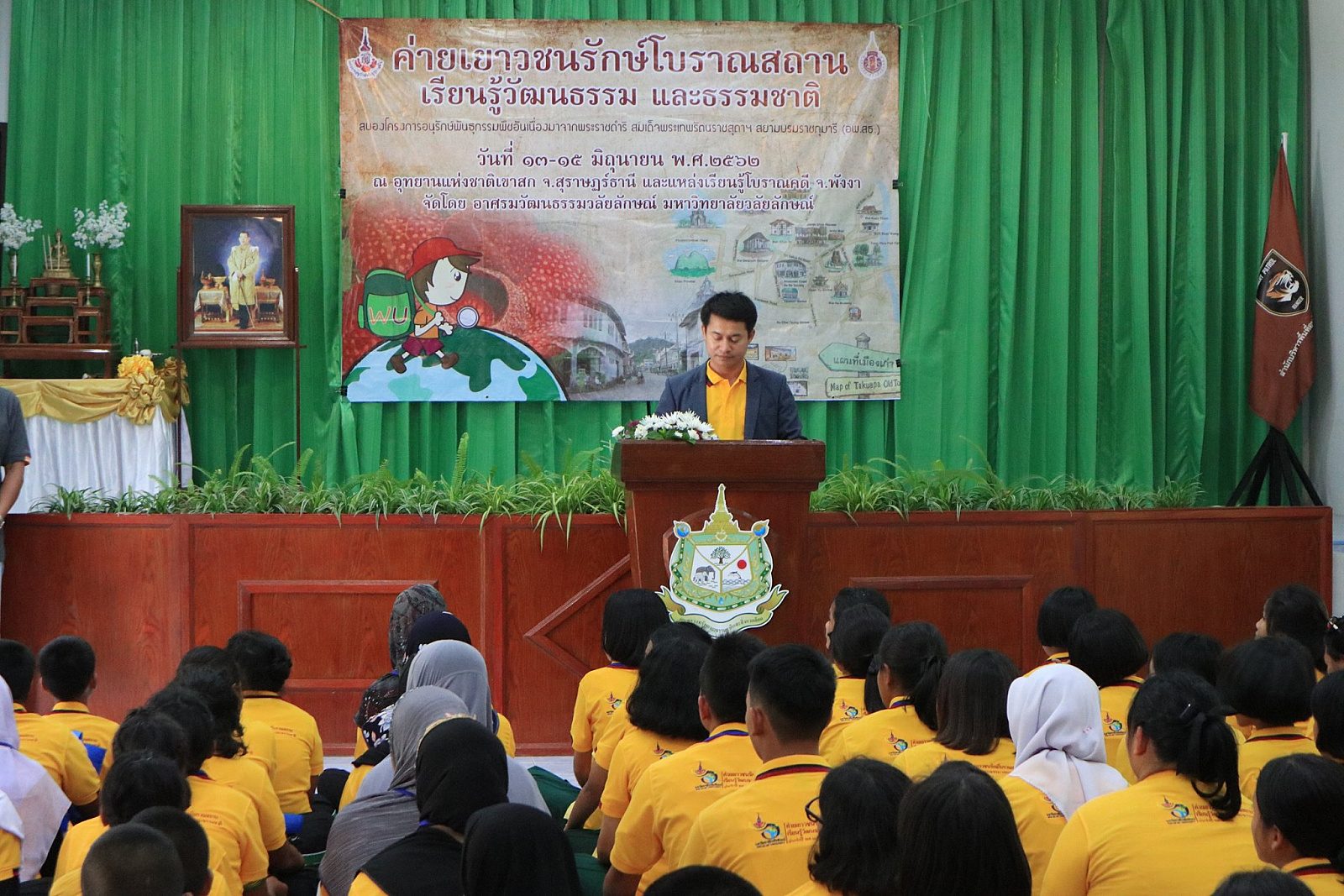 เมื่อวันที่ ๑๓-๑๕ มิถุนายน ๒๕๖๒ อาศรมวัฒนธรรมวลัยลักษณ์ จัดโครงการ “ค่ายเยาวชนรักษ์โบราณสถาน เรียนรู้วัฒนธรรมและธรรมชาติ” รุ่นที่ ๑๓ ซึ่งเป็นกิจกรรมที่สนองโครงการอนุรักษ์พันธุกรรมพืชอันเนื่องมาจากพระราชดำริ สมเด็จพระเทพรัตนราชสุดาฯ สยามบรมราชกุมารี (อพ.สธ.) ณ อุทยานแห่งชาติเขาสก จังหวัดสุราษฎร์ธานี และแหล่งเรียนรู้โบราณคดี จังหวัดพังงา โดยมีเยาวชนและคณะคณะครูอาจารย์ให้ความสนใจเข้าร่วมจำนวน ๑๔๙ คน ซึ่งมาจากต่างพื้นที่ ได้แก่จังหวัดนครศรีธรรมราช สุราษฎร์ธานี สงขลา พัทลุง สตูล ภูเก็ต ปัตตานี พัทลุง พังงา กระบี่ ระนอง ชุมพร และกรุงเทพ โดยในวันที่ ๑๓ มิถุนายน ๒๕๖๒ รศ.ดร.ศราวุธ ปาลิโภชน์ รองอธิการบดีฝ่ายกิจการนักศึกษา เป็นประธานกล่าวเปิดงานและต้อนรับชาวค่าย