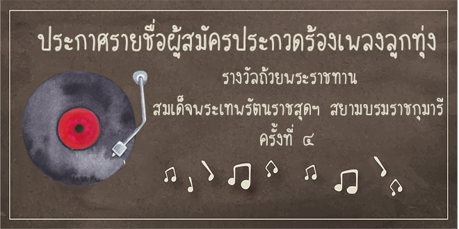 ๑๒.๐๐ – ๑๓.๐๐ น. รายงานตัวผู้เข้าประกวดลูกทุ่งชาย/หญิง เยาวชนอายุไม่เกิน ๑๖ ปี
