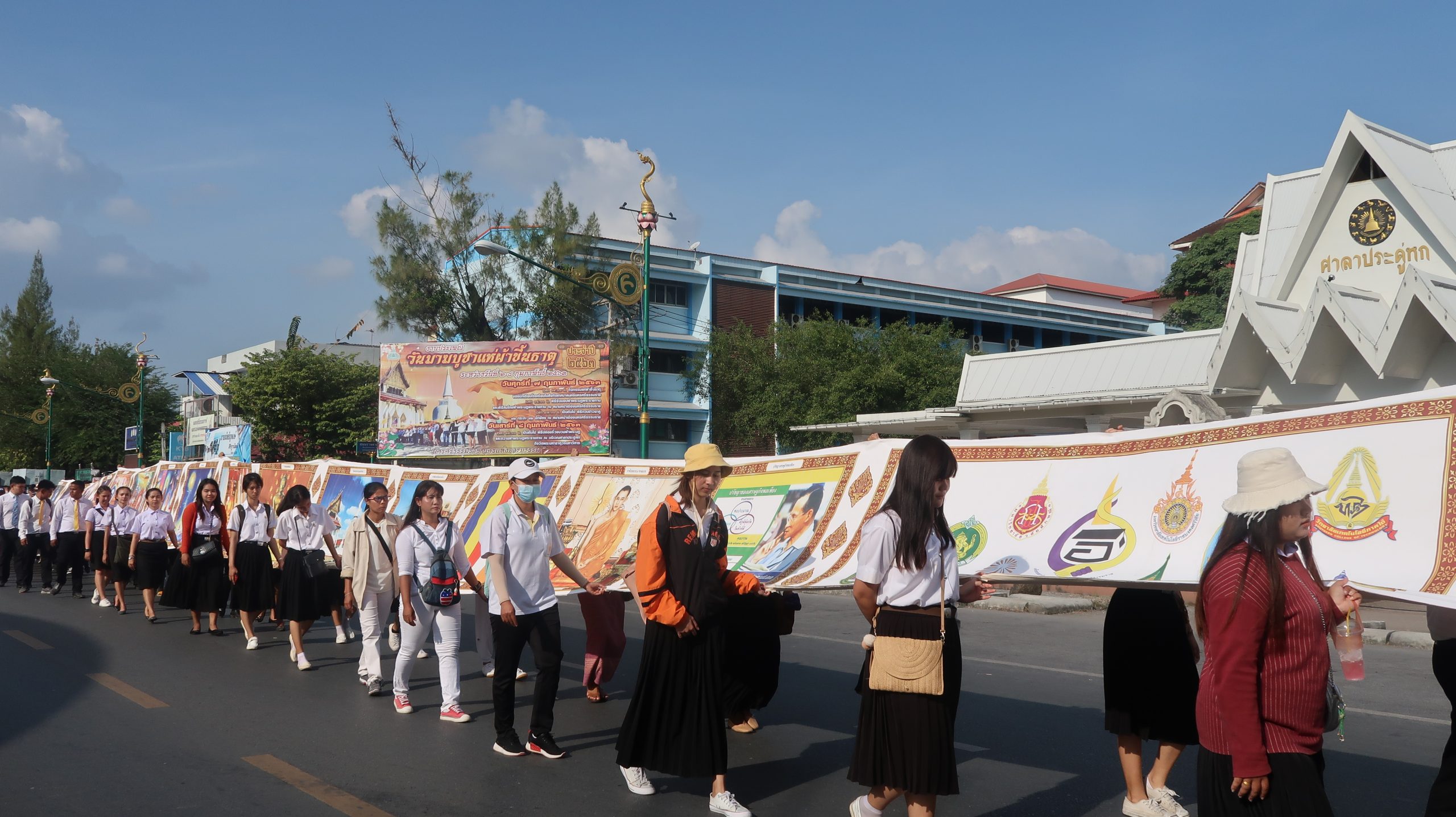 เมื่อวันที่ ๘ กุมภาพันธ์ ๒๕๖๓ รศ.ดร.ศราวุธ ปาลิโภชน์ รองอธิการบดีฝ่ายกิจการนักศึกษา คณาจารย์ บุคลากร และนักศึกษามหาวิทยาลัยวลัยลักษณ์ ร่วมริ้วขบวนอัญเชิญผ้าพระบฏพระราชทาน เนื่องในสัปดาห์ส่งเสริมพระพุทธศาสนา ในงานมาฆบูชาแห่ผ้าขึ้นธาตุ ประจำปี ๒๕๖๓ โดยร่วมเดินขบวนสืบสานประเพณีมาฆบูชาแห่ผ้าขึ้นธาตุจากศาลาประดู่หก สนามหน้าเมือง ผ่านถนนเส้นราชดำเนินไปยังวัดพระมหาธาตุ วรมหาวิหาร จังหวัดนครศรีธรรมราช ซึ่งประเพณีมาฆบูชาแห่ผ้าขึ้นธาตุถือเป็นประเพณีที่สำคัญของชาวจังหวัดนครศรีธรรมราชที่จัดสืบทอดกันมา ๗๙๐ ปี มีพุทธศาสนิกชนทั้งในพื้นที่ ต่างจังหวัด และต่างประเทศที่มีจิตศรัทธามาร่วมพิธีกันอย่างเนืองแน่น
