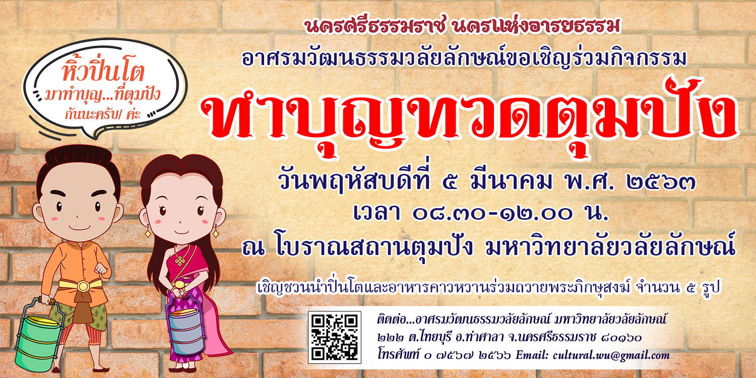 อาศรมวัฒนธรรมวลัยลักษณ์ มหาวิทยาลัยวลัยลักษณ์ ขอเชิญทุกท่านเข้าร่วมพิธีทำบุญทวดตุมปัง ประจำปี ๒๕๖๓ ในวันพฤหัสบดีที่ ๕ มีนาคม พ.ศ. ๒๕๖๓ เวลา ๐๘.๓๐ – ๑๑.๓๐ น. ณ ลานพิธีโบราณสถานตุมปัง มหาวิทยาลัยวลัยลักษณ์ เพื่อบวงสรวงและแสดงความเคารพต่อสิ่งศักดิ์สิทธิ์ ณ โบราณสถานตุมปัง และส่งเสริม ปลูกฝังคุณค่าด้านคุณธรรมจริยธรรม เสริมสร้างความภาคภูมิใจในความเป็น “นครศรีธรรมราช นครแห่งอารยธรรม” พร้อมทั้งกระตุ้นให้นักศึกษา บุคลากร และประชาชนได้เล็งเห็นถึงคุณค่าของแหล่งโบราณสถาน แหล่งเรียนรู้ด้านประวัติศาสตร์และโบราณคดีที่สำคัญของจังหวัดนครศรีธรรมราชและโบราณคดีที่สำคัญของชาติสืบไป