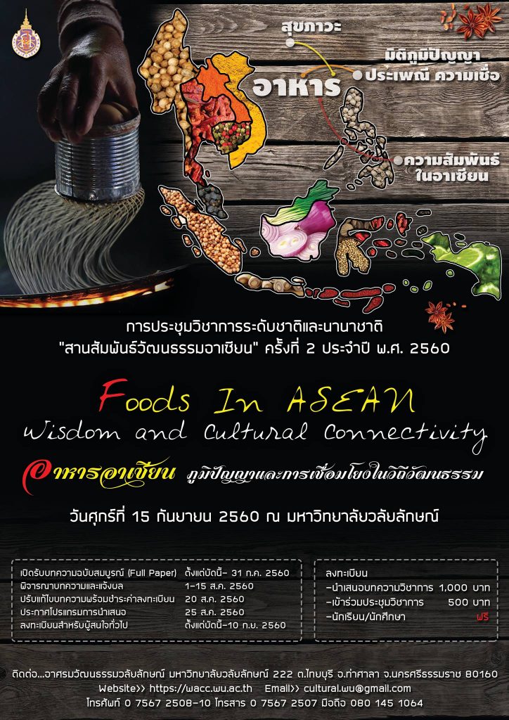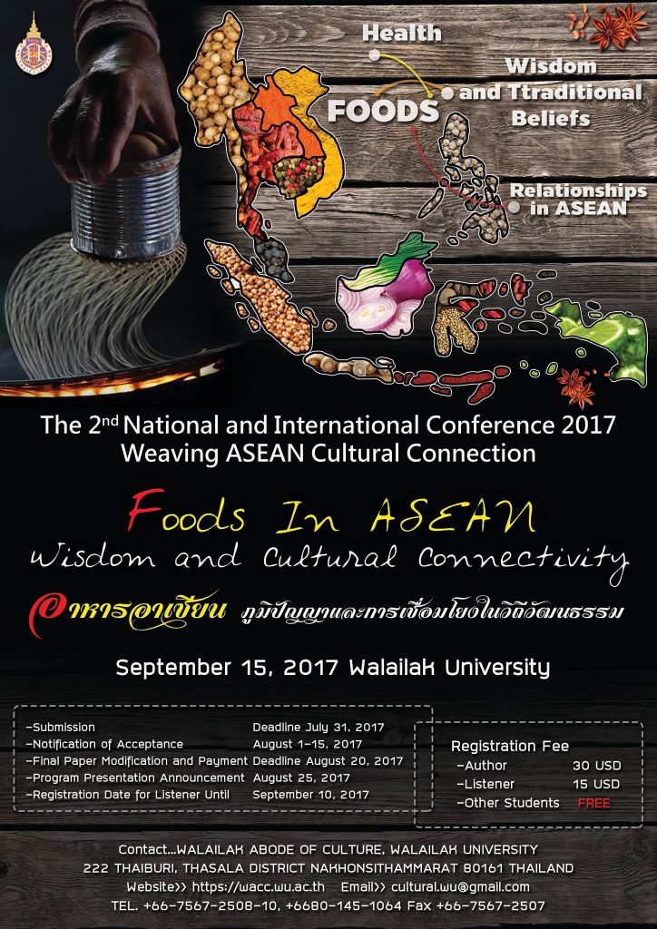 มหาวิทยาลัยวลัยลักษณ์ โดยอาศรมวัฒนธรรมวลัยลักษณ์ กำหนดจัดงานการประชุมวิชาการระดับชาติและนานาชาติ “สานสัมพันธ์วัฒนธรรมอาเซียน” ครั้งที่ 2 ประจำปี พ.ศ.2560 The 2nd National and International Conference 2017 Weaving ASEAN Cultural Connection ภายใต้แนวคิด อาหารอาเซียน : ภูมิปัญญา และการเชื่อมโยงในวิถีวัฒนธรรม Foods In ASEAN : Wisdom and Cultural Connectivity ในวันที่ 15 กันยายน 2560 ณ อาคารปฏิบัติการเทคโนโลยีและพัฒนานวัตกรรม มหาวิทยาลัยวลัยลักษณ์ เพื่อเป็นเวทีสาธารณะด้านศิลปและวัฒนธรรมในการวิจัยและวิชาการให้กับคณาจารย์ นักวิจัย นักวิชาการ นักศึกษาได้แลกเปลี่ยนความรู้ อันจะนำไปสู่การสร้างเครือข่ายความร่วมมือทางวิชาการในระดับอาเซียน การพัฒนาต่อยอดงานวิจัย ตลอดจนพัฒนางานวิจัยไปสู่สาธารณะ เพื่อกระตุ้นให้เกิดความร่วมมือในระดับอาเซียนอันจะนำมาซึ่งการพัฒนาทางด้านวิชาการอย่างยั่งยืนซึ่งมีกิจกรรมดังนี้ ปาฐกถาพิเศษ “อาหาร ความหลากหลายภูมิปัญญาในอาเซียน”, การจัดเสวนาประเด็น “อาหารอาเซียน”, การนำเสนอผลงานวิชาการในรูปแบบบรรยาย (Oral Presentations) “อาหารอาเซียน” , การจัดแสดงนิทรรศการ วัฒนธรรม “อาหารอาเซียน” และการสาธิตการทำอาหารประจำถิ่น ในกลุ่มประเทศอาเซียนมหาวิทยาลัยวลัยลักษณ์ โดยอาศรมวัฒนธรรมวลัยลักษณ์ กำหนดจัดงานการประชุมวิชาการระดับชาติและนานาชาติ “สานสัมพันธ์วัฒนธรรมอาเซียน” ครั้งที่ 2 ประจำปี พ.ศ.2560 The 2nd National and International Conference 2017 Weaving ASEAN Cultural Connection ภายใต้แนวคิด อาหารอาเซียน : ภูมิปัญญา และการเชื่อมโยงในวิถีวัฒนธรรม Foods In ASEAN : Wisdom and Cultural Connectivity ในวันที่ 15 กันยายน 2560 ณ อาคารปฏิบัติการเทคโนโลยีและพัฒนานวัตกรรม มหาวิทยาลัยวลัยลักษณ์ เพื่อเป็นเวทีสาธารณะด้านศิลปและวัฒนธรรมในการวิจัยและวิชาการให้กับคณาจารย์ นักวิจัย นักวิชาการ นักศึกษาได้แลกเปลี่ยนความรู้ อันจะนำไปสู่การสร้างเครือข่ายความร่วมมือทางวิชาการในระดับอาเซียน การพัฒนาต่อยอดงานวิจัย ตลอดจนพัฒนางานวิจัยไปสู่สาธารณะ เพื่อกระตุ้นให้เกิดความร่วมมือในระดับอาเซียนอันจะนำมาซึ่งการพัฒนาทางด้านวิชาการอย่างยั่งยืนซึ่งมีกิจกรรมดังนี้ ปาฐกถาพิเศษ “อาหาร ความหลากหลายภูมิปัญญาในอาเซียน”, การจัดเสวนาประเด็น “อาหารอาเซียน”, การนำเสนอผลงานวิชาการในรูปแบบบรรยาย (Oral Presentations) “อาหารอาเซียน” , การจัดแสดงนิทรรศการ วัฒนธรรม “อาหารอาเซียน” และการสาธิตการทำอาหารประจำถิ่น ในกลุ่มประเทศอาเซียน