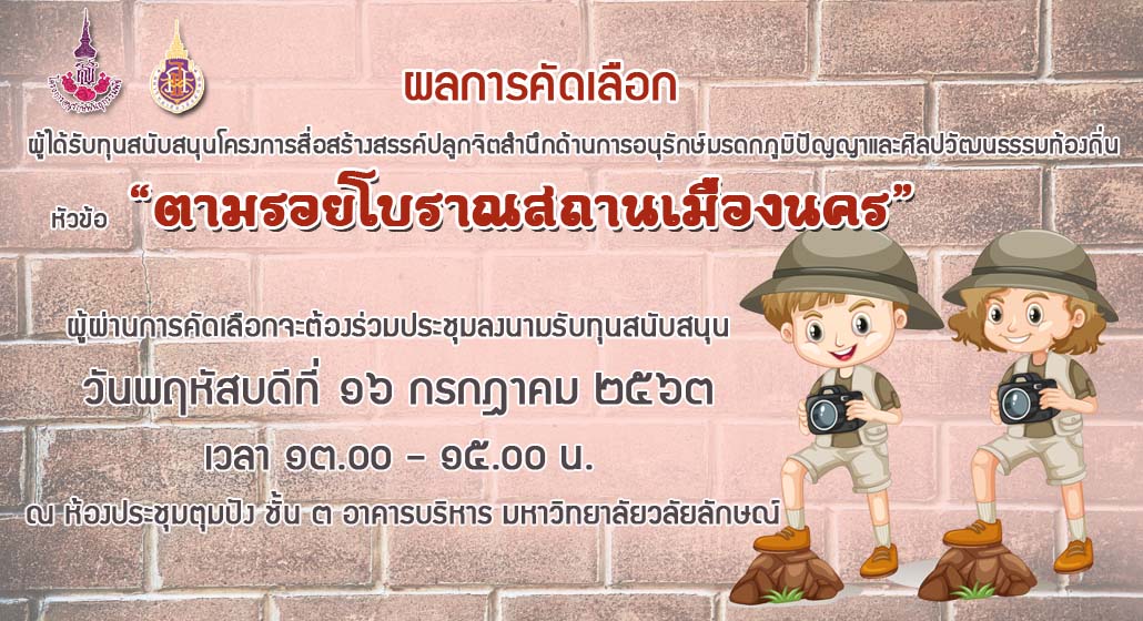 ตามที่อาศรมวัฒนธรรมวลัยลักษณ์ได้จัดให้มีโครงการสื่อสร้างสรรค์ปลูกจิตสำนึกด้านการอนุรักษ์มรดก ภูมิปัญญาและศิลปวัฒนธรรมท้องถิ่น หัวข้อ “ตามรอยโบราณสถานเมืองนคร”โดยมีวัตถุประสงค์เพื่อเปิดโอกาสให้เยาวชนได้ศึกษาหาความรู้เกี่ยวกับทรัพยากรท้องถิ่นโดยมีการเชื่อมโยงกับมิติด้านประวัติศาสตร์โบราณคดี ศิลปะและวัฒนธรรมควบคู่กันไปด้วย อันจะส่งผลสู่การสร้างจิตสำนึกในการอนุรักษ์ทรัพยากรของประเทศแก่เยาวชนและประชาชนทั่วไป เกิดการต่อยอดในการกระตุ้นให้สถานศึกษาและภาคส่วนต่างๆ เล็งเห็นความสำคัญในการส่งเสริมและปลูกฝังให้เยาวชนเข้าใจถึงความสำคัญและประโยชน์ของทรัพยากรชีวภาพ กายภาพ ภูมิปัญญาและวัฒนธรรม เพื่อให้รู้จักหวงแหน รู้จักการนำไปใช้ประโยชน์อย่างยั่งยืน ซึ่งมีความสำคัญต่อการจัดการ และการอนุรักษ์และใช้ทรัพยากรของประเทศอย่างรู้คุณค่า และได้ประกาศเชิญชวนเยาวชนให้ส่งข้อเสนอโครงการเพื่อรับทุนสนับสนุนการผลิตสื่อสร้างสรรค์ปลูกจิตสำนึกด้านการอนุรักษ์มรดกภูมิปัญญาและศิลปวัฒนธรรมท้องถิ่นหัวข้อ “ตามรอยโบราณสถานเมืองนคร” รวมจำวน ๑๕ ทุน ทุนละ ๑๐,๐๐๐ บาท (หนึ่งหมื่นบาทถ้วน) ซึ่งจากการพิจารณาข้อเสนอโครงการดังกล่าวปรากฏมีผู้ผ่านการคัดเลือกเพื่อรับทุนสนับสนุน ดังนี้
