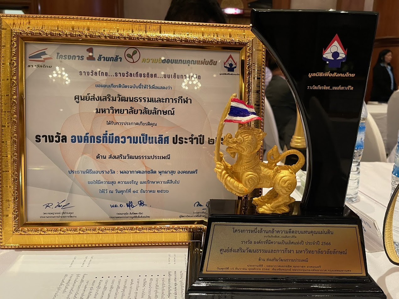 วันที่ 15 ธันวาคม 2566 ผศ.ดร.มาริสา ภูมิภาค ณ หนองคาย ผู้อำนวยการศูนย์ส่งเสริมวัฒนธรรมและการกีฬา มหาวิทยาลัยวลัยลักษณ์ เข้ารับรางวัลองค์กรที่มีความเป็นเลิศ ประจำปี 2566 ด้านส่งเสริมวัฒนธรรมประเพณี ในโครงการหนึ่งล้านความดีตอบแทนคุณแผ่นดิน ของมูลนิธิเพื่อสังคมไทย ซึ่งศูนย์ส่งเสริมวัฒนธรรมและการกีฬา ได้มีแผนงานการขับเคลื่องานด้านส่งเสริมวัฒนธรรมประเพณี มีการจัดโครงการ กิจกรรม ทำนุ บำรุงศิลปวัฒนธรรมและสืบสานวัฒนธรรมประเพณี โดยส่งเสริมให้เยาวชนมีได้มีโอกาสแสดงความสามารถด้านต่างๆ ที่เกี่ยวข้องกับวัฒนธรรมประเพณีที่ดีงาม ร่วมอนุรักษ์ศิลปะการแสดงของท้องถิ่น และร่วมเผยแพร่ให้เป็นที่รู้จักทางช่องทางต่างๆ อย่างต่อเนื่องเสมอมา