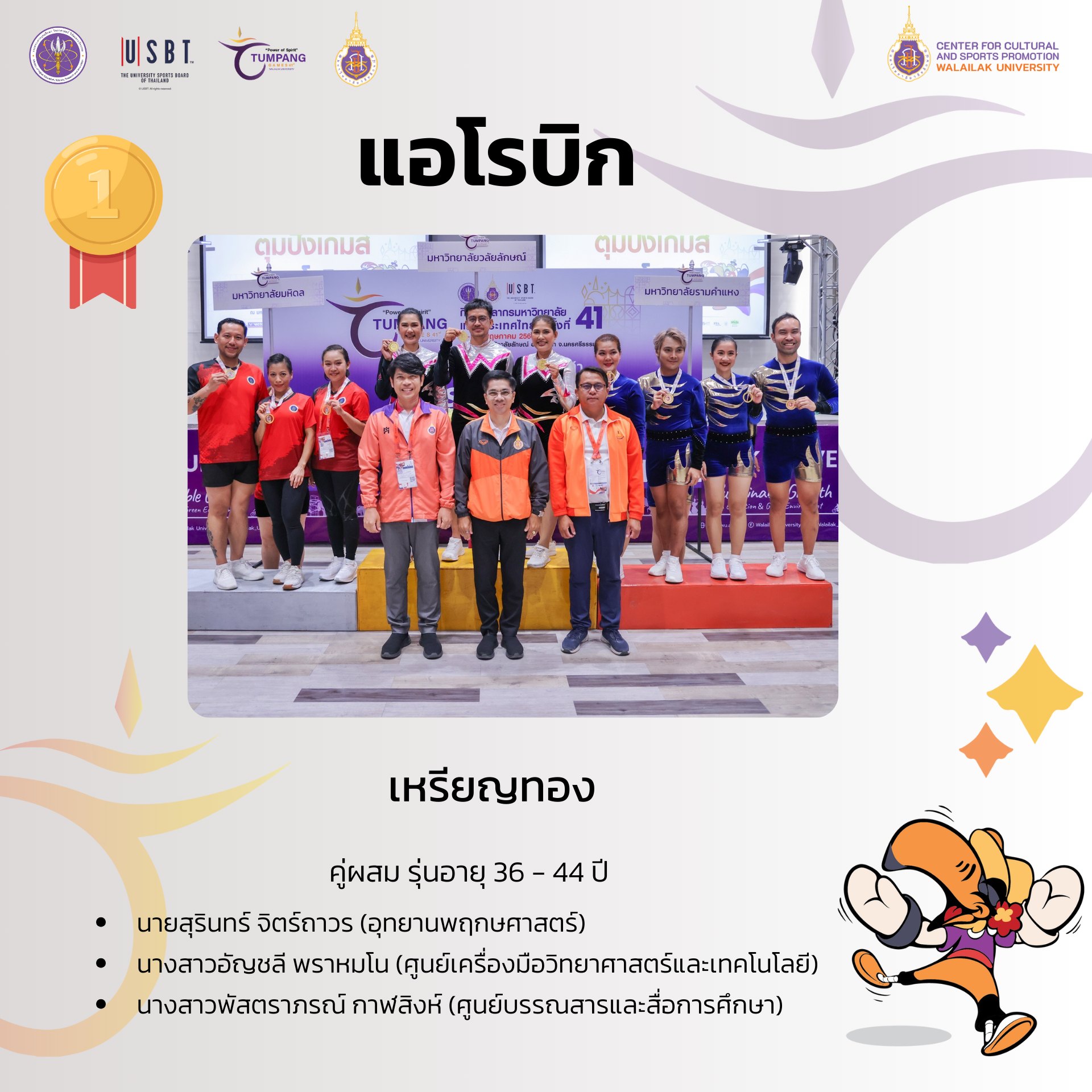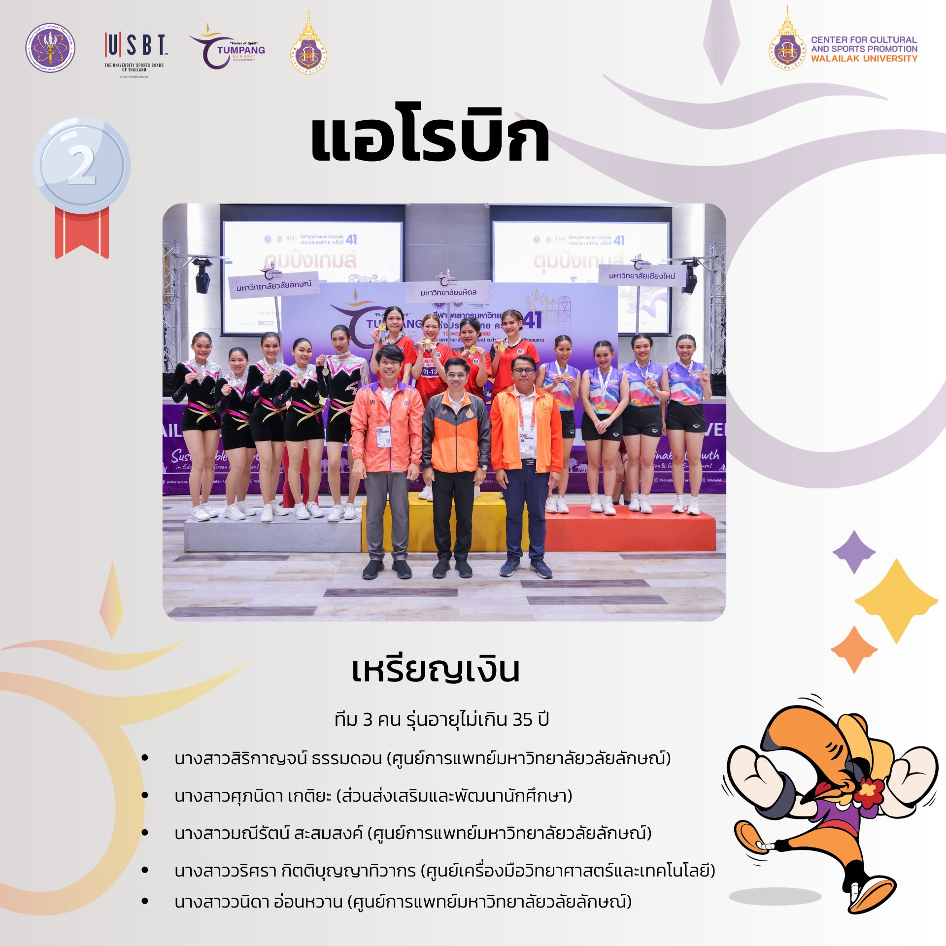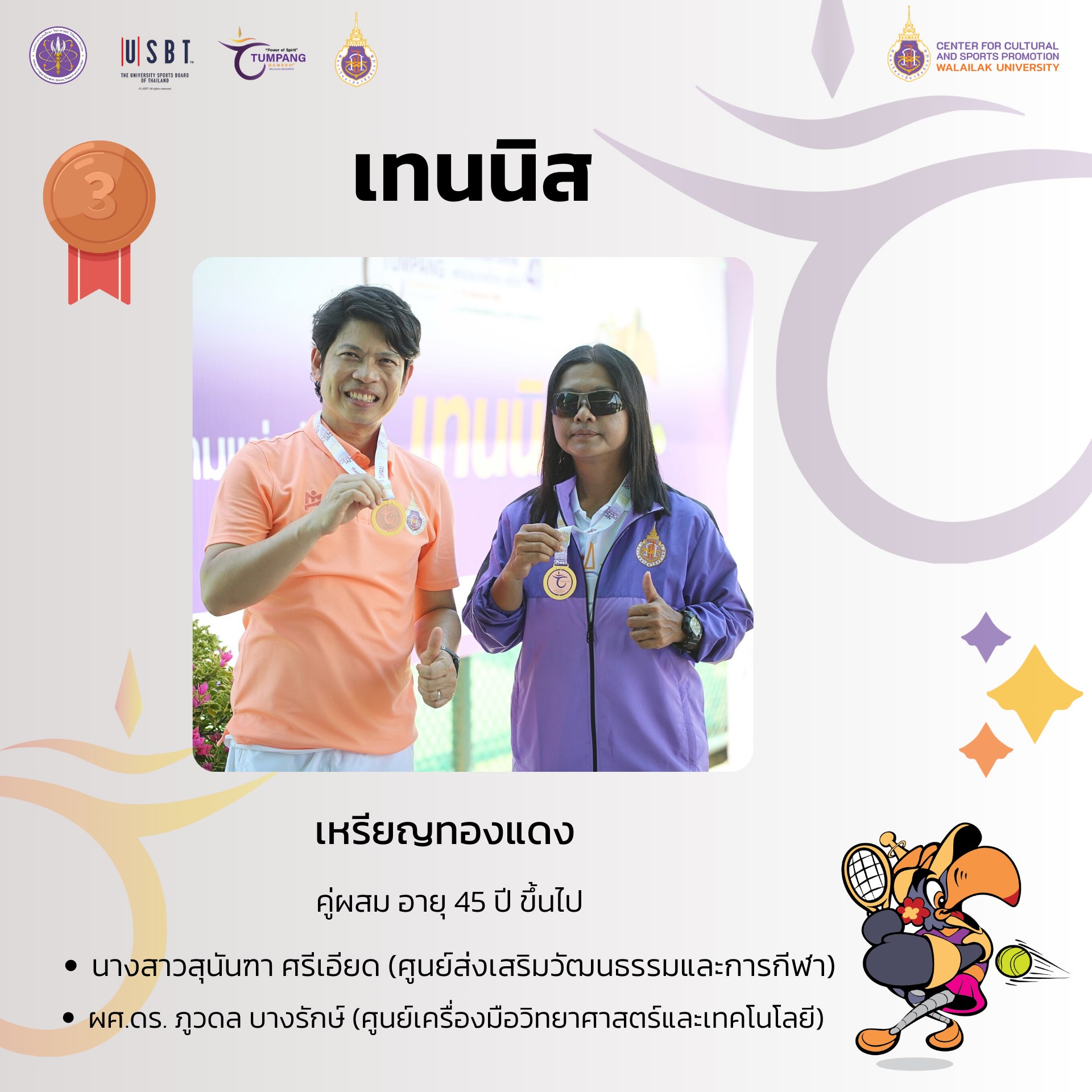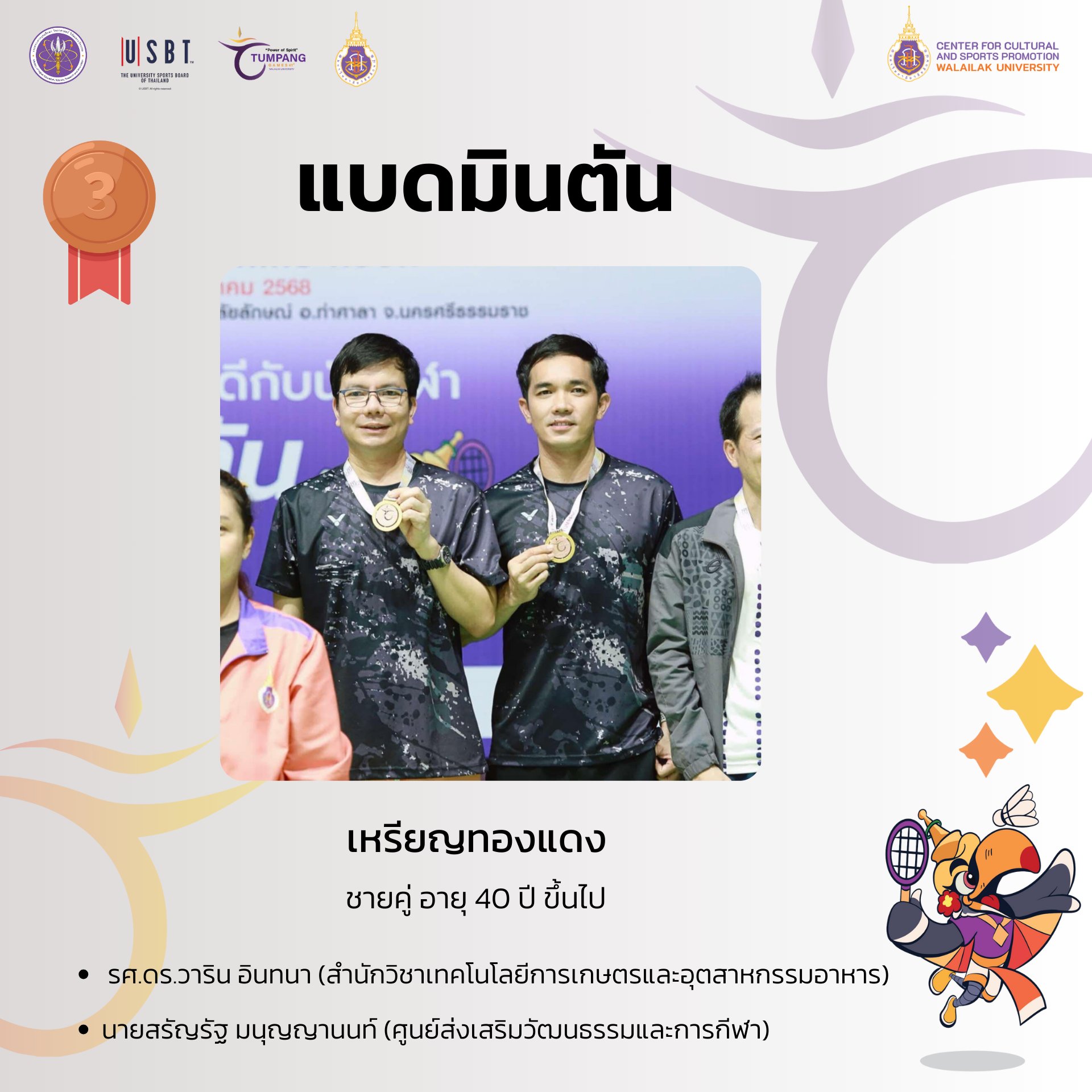 การแข่งขันกีฬาบุคลากรมหาวิทยาลัยแห่งประเทศไทย ครั้งที่ 41 “ตุมปังเกมส์” ซึ่งจัดขึ้นระหว่างวันที่ 3-10 พฤษภาคม 2568 ที่ผ่านมา มีการชิงชัยกันเหรียญทองกันทั้งสิ้น รวม 426 เหรียญทอง ผลปรากฎว่า มหาวิทยาลัยวลัยลักษณ์ ซึ่งเป็นเจ้าภาพในการแข่งขัน สามารถทำผลได้งานได้ยอดเยี่ยม คว้า 4 เหรียญทอง 8 เหรียญเงิน 9 เหรียญทองแดง รวมทั้งสิ้น 21 เหรียญ
