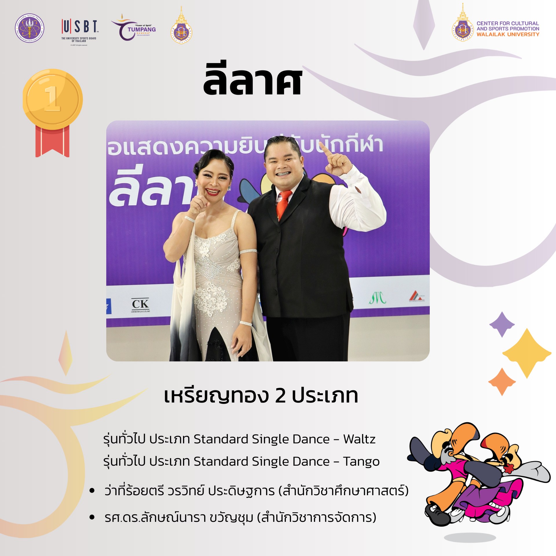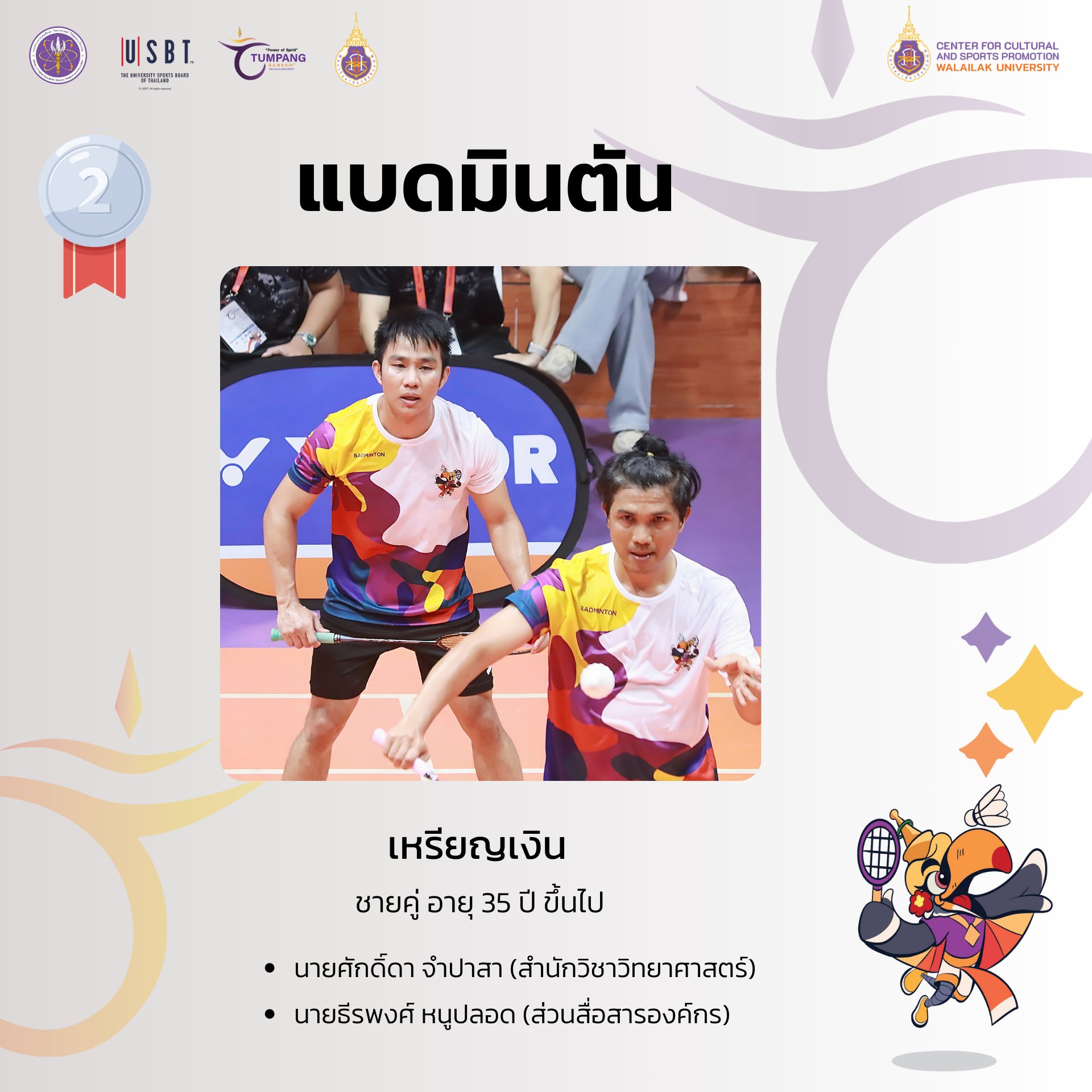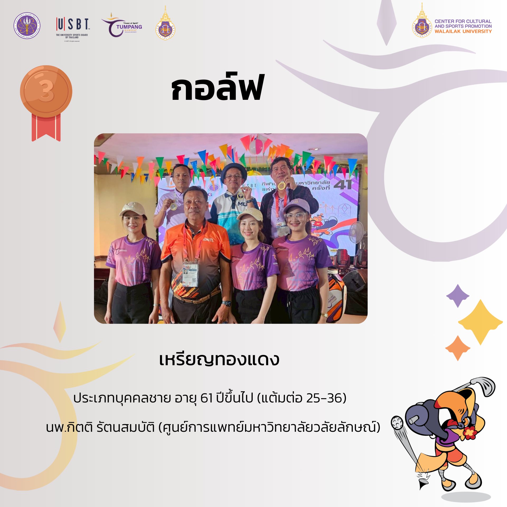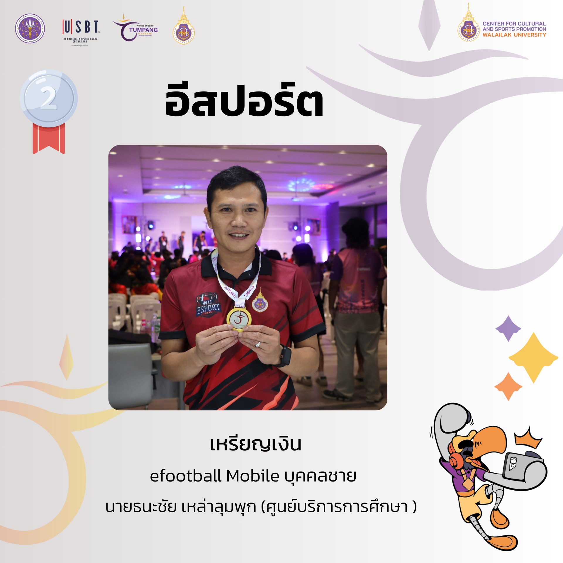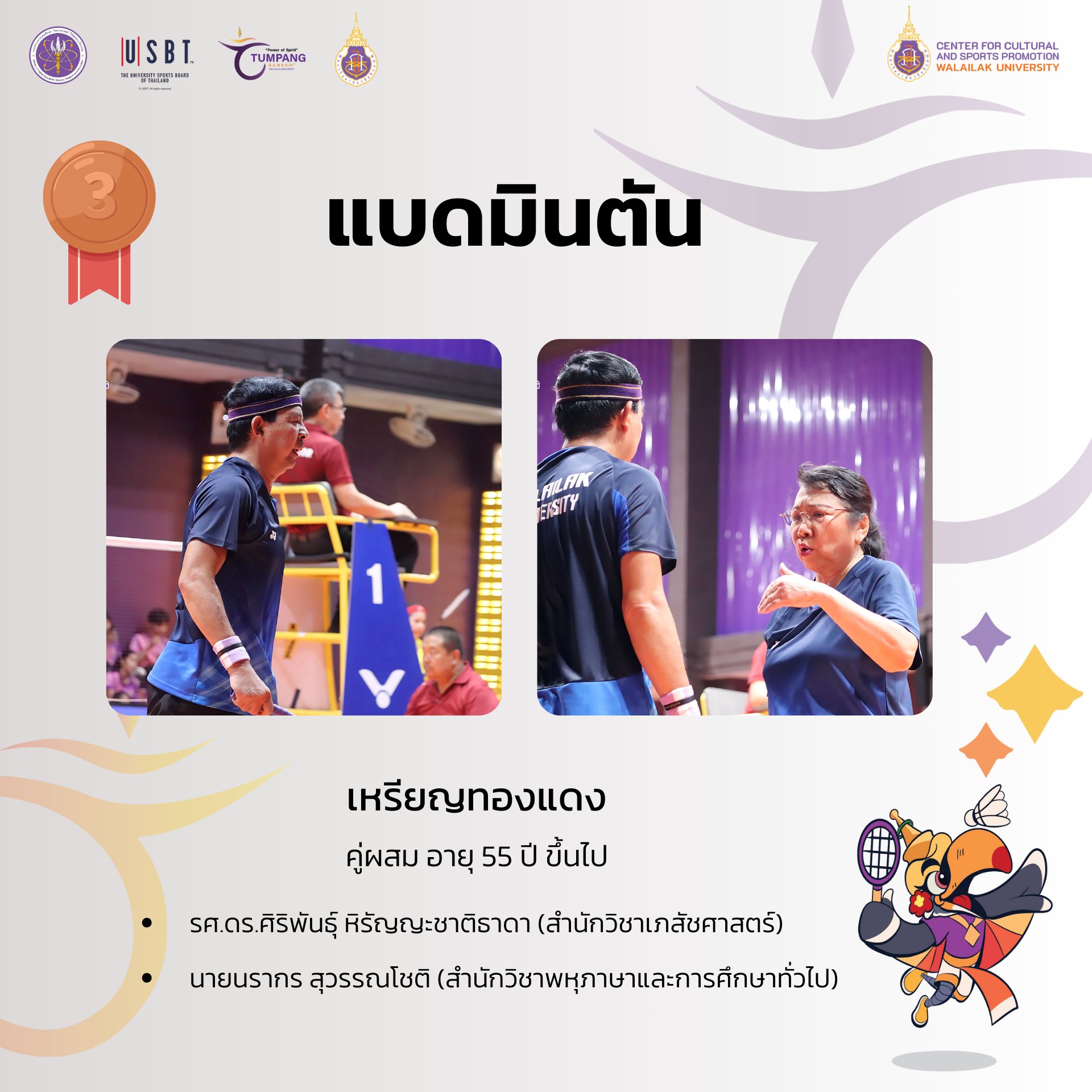 การแข่งขันกีฬาบุคลากรมหาวิทยาลัยแห่งประเทศไทย ครั้งที่ 41 “ตุมปังเกมส์” ซึ่งจัดขึ้นระหว่างวันที่ 3-10 พฤษภาคม 2568 ที่ผ่านมา มีการชิงชัยกันเหรียญทองกันทั้งสิ้น รวม 426 เหรียญทอง ผลปรากฎว่า มหาวิทยาลัยวลัยลักษณ์ ซึ่งเป็นเจ้าภาพในการแข่งขัน สามารถทำผลได้งานได้ยอดเยี่ยม คว้า 4 เหรียญทอง 8 เหรียญเงิน 9 เหรียญทองแดง รวมทั้งสิ้น 21 เหรียญ