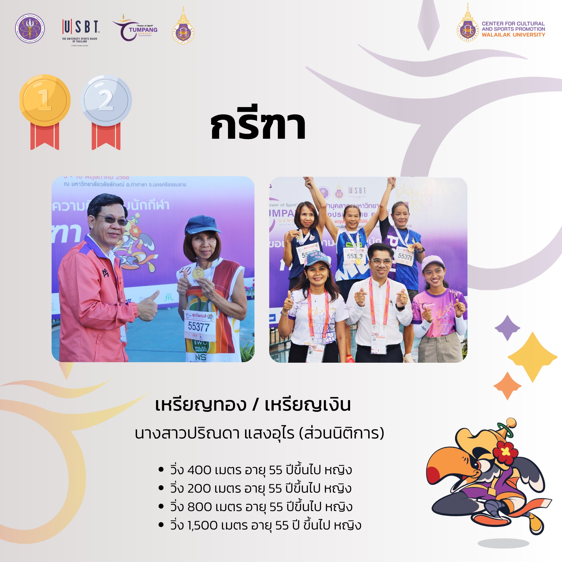 – วิ่ง 400 เมตร อายุ 55 ปีขึ้นไป หญิง นางสาวปริณดา แสงอุไร ส่วนนิติการ