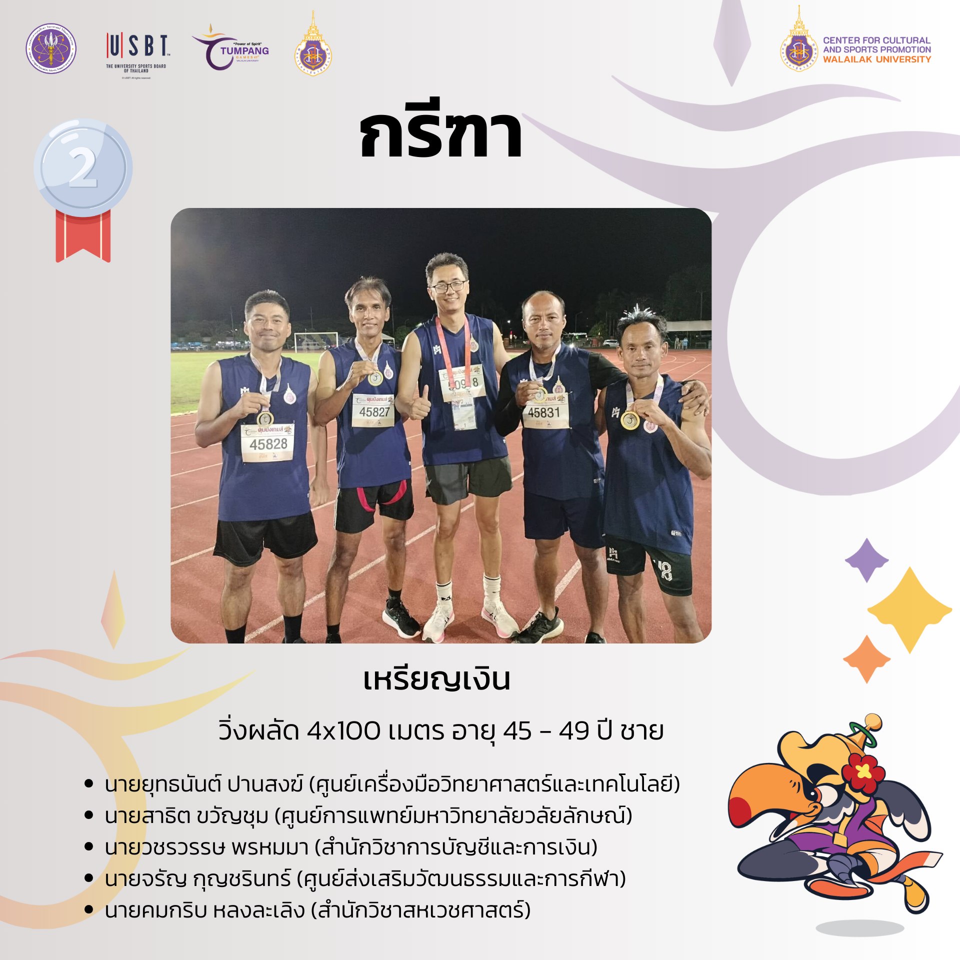 – วิ่งผลัด 4×100 เมตร อายุ 45 – 49 ปี ชาย
