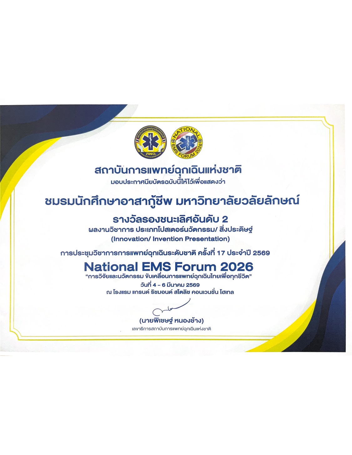 2. รางวัลนวัตกรรมระดับชาติ (National EMS Forum 2026)