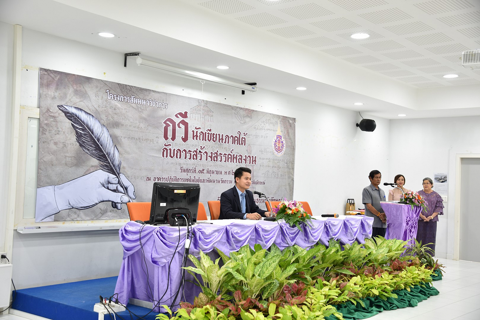 การจัดสัมมนาวิชาการครั้งนี้ ได้รับเกียรติจาก รองศาสตราจารย์ ดร. ไพฑูรย์ ธัญญา ศิลปินแห่งชาติ สาขาวรณกรรม คุณศิลา โคมฉาย นักเขียนรางวัลซีไรต์ อาจารย์สมใจ สมคิด นักเขียนรางวัลพานแว่นฟ้า ตลอดจนนักเขียนที่มีชื่อเสียงในระดับประเทศซึ่งเป็นคนใต้ เช่น คุณประมวล มณีโรจน์ คุณจรูญ หยูทอง รองศาสตราจารย์วิมล ดำศรี มหาวิทยาลัยราชภัฎนครศรีธรรมราช และอาจารย์บุญเสริม แก้วพรหม ร่วมเป็นวิทยากรในการแลกเปลี่ยนเรียนรู้ด้านวรรณกรรมภาคใต้ โดยมีการปาฐกถาพิเศษเรื่อง “พัฒนาการของวรรณกรรมภาคใต้” โดย ศาสตราจารย์ชวน เพชรแก้ว การเสวนาเรื่อง “การสร้างสรรค์ผลงานวรรณกรรมของกวีและนักเขียนชาวใต้” และการเสวนาเรื่อง “แรงบันดาลใจสู่พลังสร้างสรรค์วรรณกรรมของกวีและนักเขียนรุ่นใหม่” อีกด้วย