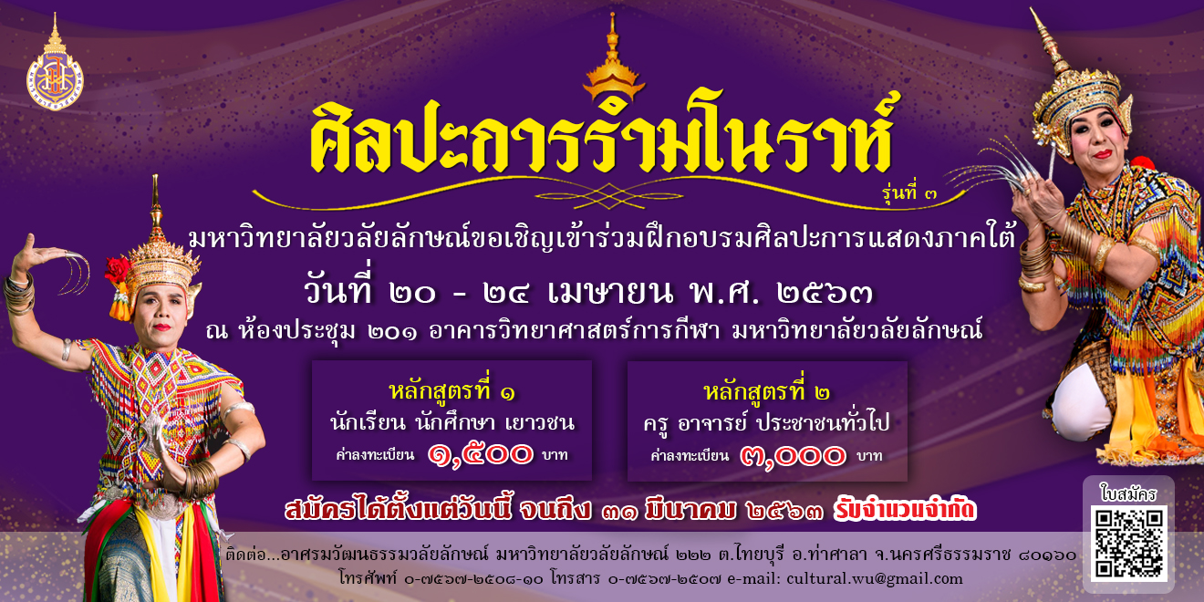 ขอเชิญสมัครเข้าร่วมฝึกอบรมศิลปะการแสดงภาคใต้ ประจำปี พ.ศ.๒๕๖๓ “ศิลปะการรำมโนราห์ รุ่นที่ ๓” อ่านต่อ » กุมภาพันธ์ 1, 2563