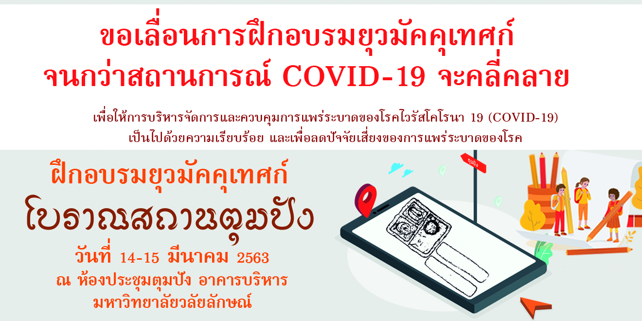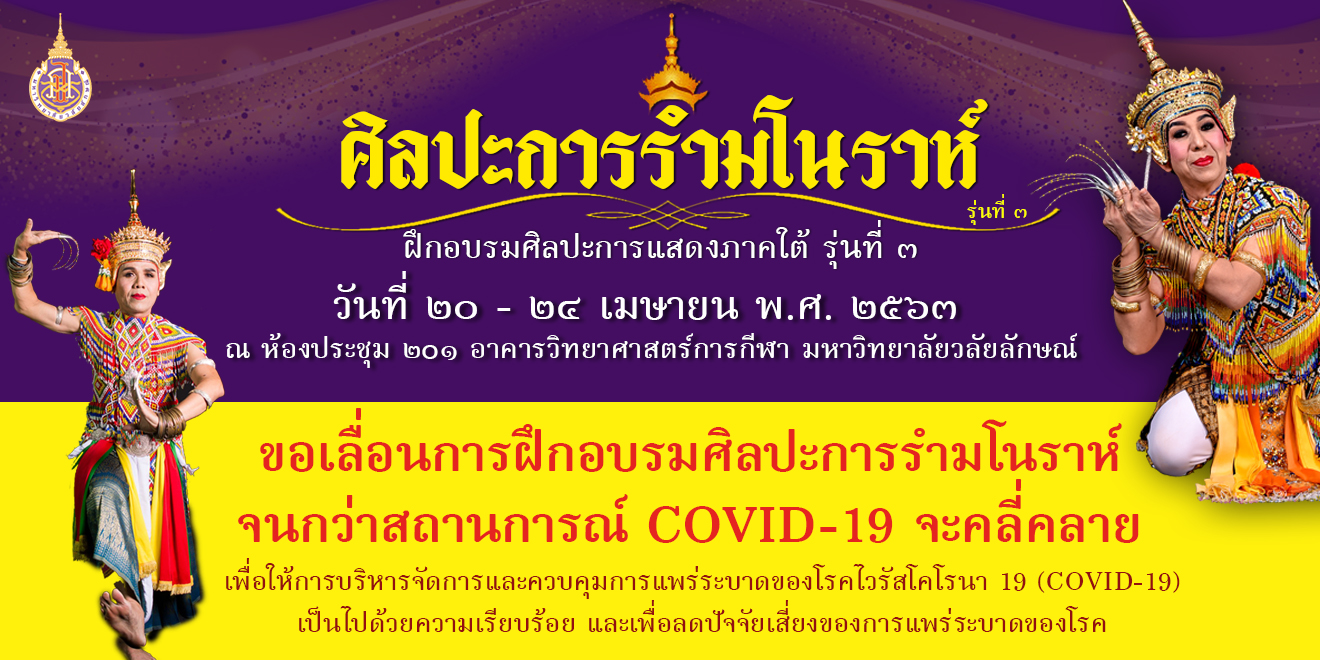 ขอเลื่อนการฝึกอบรมศิลปะการแสดงภาคใต้ ประจำปี พ.ศ.๒๕๖๓ “ศิลปะการรำมโนราห์ รุ่นที่ ๓” อ่านต่อ » มีนาคม 9, 2563