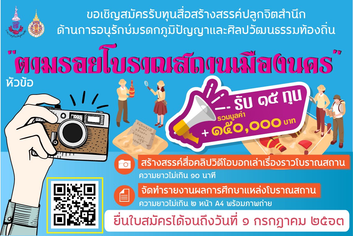 ขอเชิญรับสมัครทุนสนับสนุนโครงการสื่อสร้างสรรค์ปลูกจิตสำนึกด้านการอนุรักษ์มรดกภูมิปัญญา และศิลปวัฒนธรรมท้องถิ่น หัวข้อ “ตามรอยโบราณสถานเมืองนคร” อ่านต่อ » พฤษภาคม 22, 2563