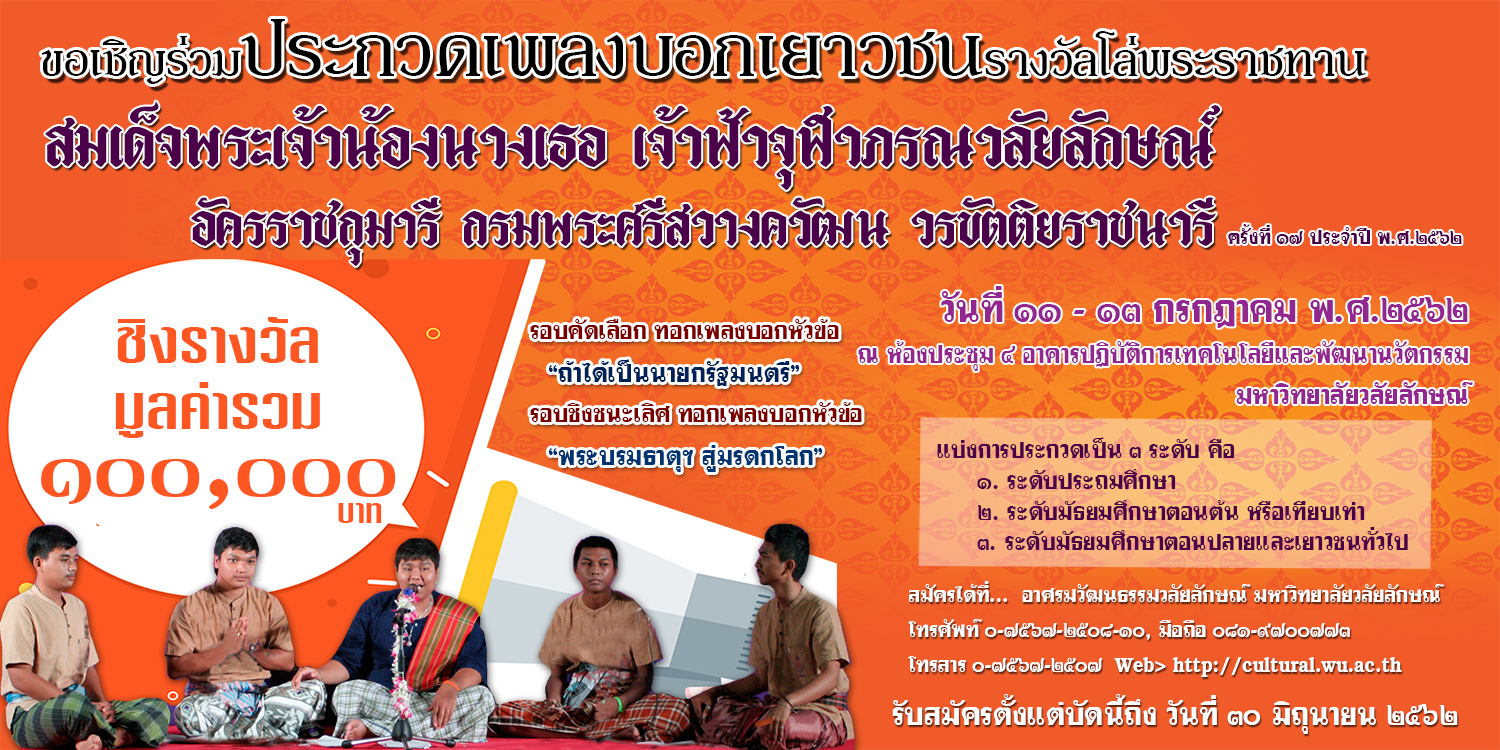 ขอเชิญเข้าร่วมการแข่งขันร้อยกรองรางวัลโล่พระราชทาน สมเด็จพระเจ้าน้องนางเธอ เจ้าฟ้าจุฬาภรณวลัยลักษณ์ อัครราชกุมารี กรมพระศรีสวางควัฒน วรขัตติยราชนารี ครั้งที่ ๑๘ ประจำปี พ.ศ. ๒๕๖๒ อ่านต่อ » มิถุนายน 5, 2562