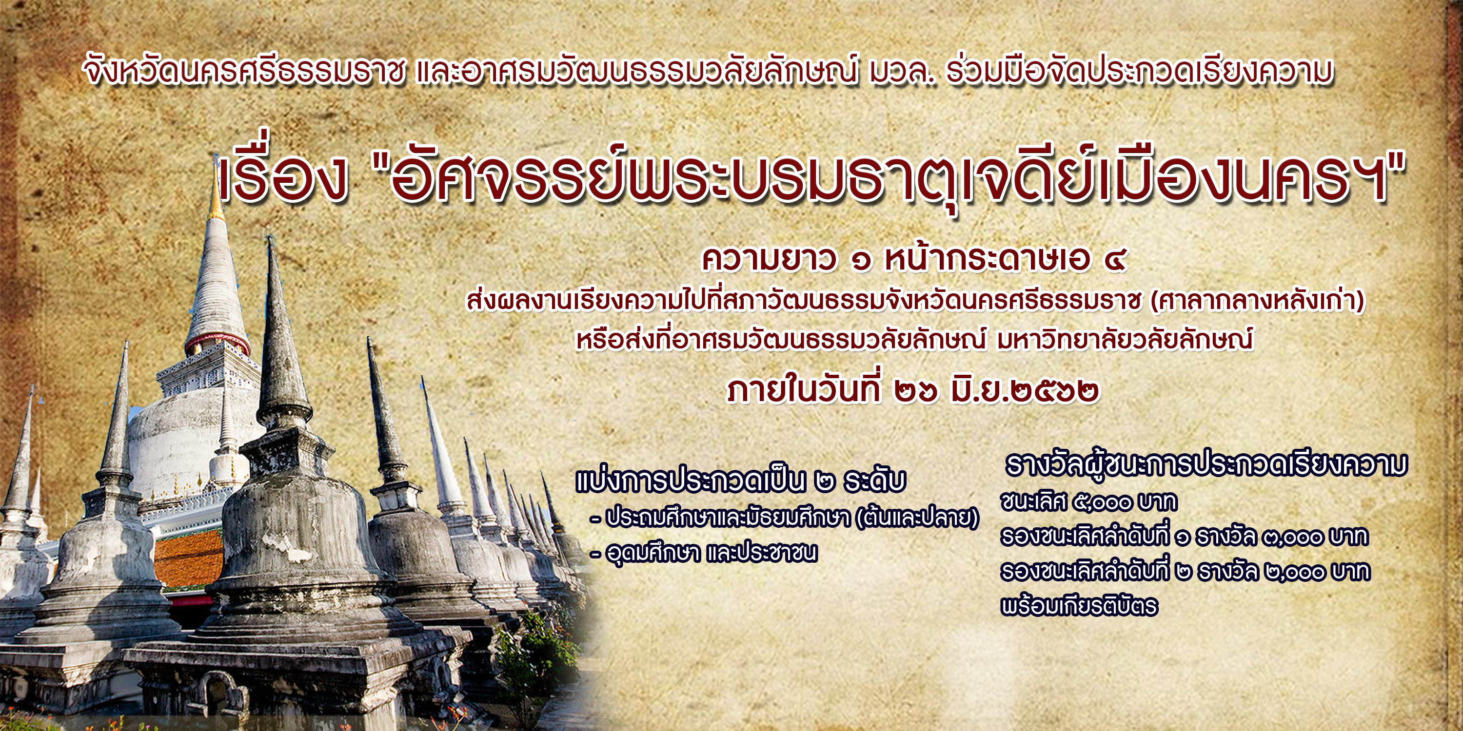 ขอเชิญส่งเรียงความเข้าร่วมประกวด หัวข้อ “อัศจรรย์พระบรมธาตุเจดีย์เมืองนครฯ” อ่านต่อ » มิถุนายน 21, 2562