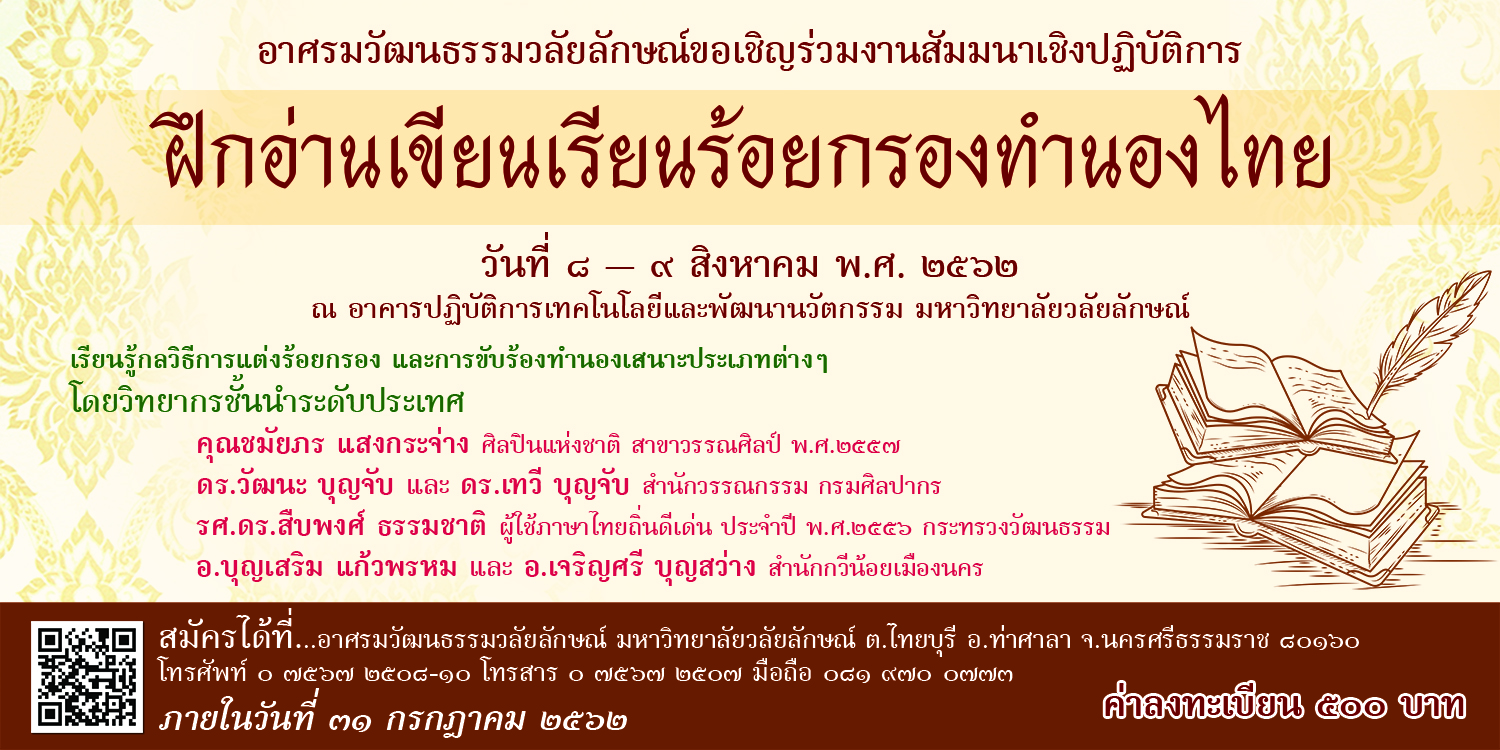 ขอเชิญน้อง ๆ ระดับชั้นมัธยมศึกษาตอนปลายเข้าร่วมโครงการค่ายเพชรภาษาไทยวลัยลักษณ์ รุ่นที่ ๑ อ่านต่อ » เมษายน 21, 2562