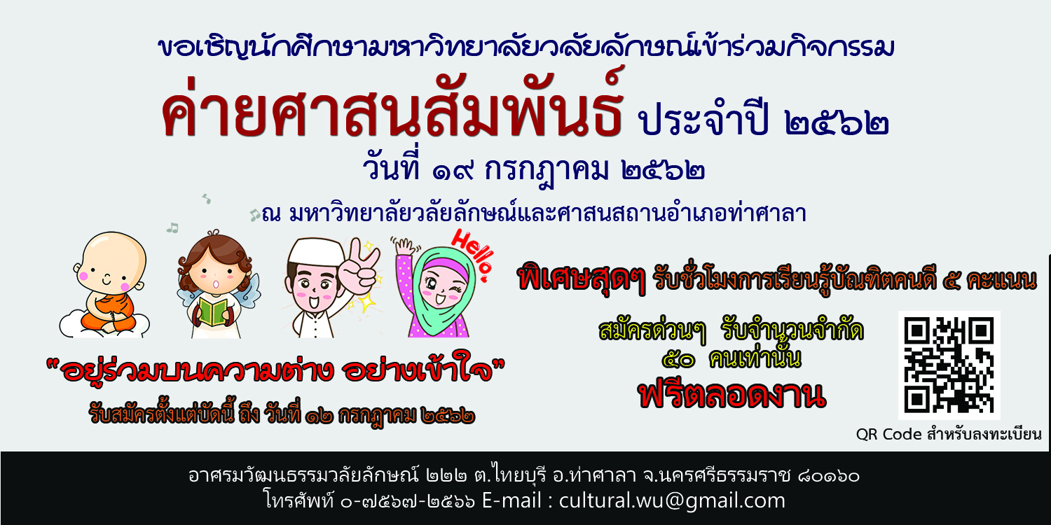 ขอเชิญนักศึกษามหาวิทยาลัยวลัยลักษณ์เข้าร่วมกิจกรรม ค่ายศาสนสัมพันธ์ ประจำปี ๒๕๖๒ อ่านต่อ » กรกฎาคม 11, 2562