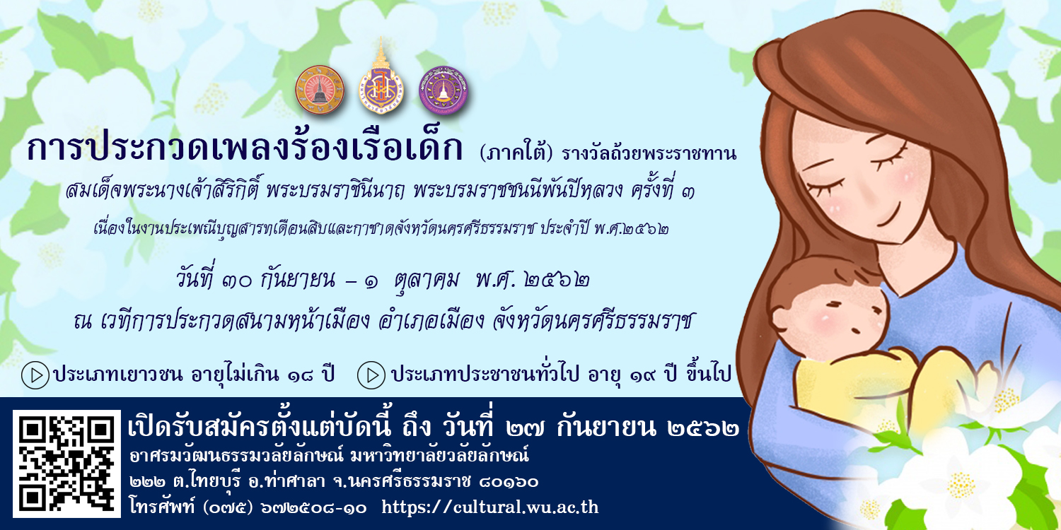 ขอเชิญร่วมประกวดเพลงร้องเรือเด็ก (ภาคใต้) รางวัลถ้วยพระราชทานสมเด็จพระนางเจ้าสิริกิติ์ พระบรมราชินีนาถ พระบรมราชชนนีพันปีหลวง ครั้งที่ ๓ อ่านต่อ » กันยายน 3, 2562