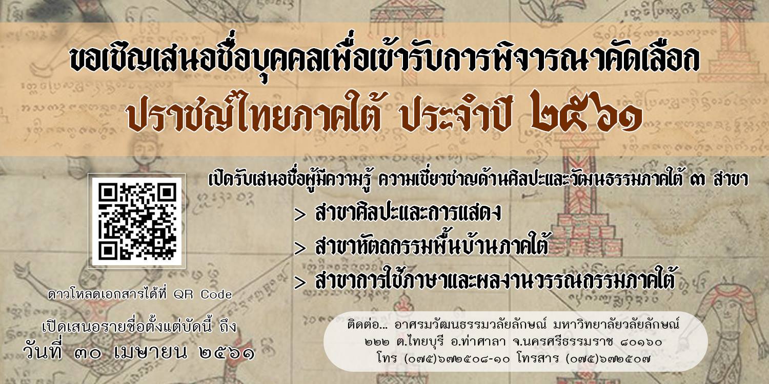 ขอเชิญเสนอชื่อบุคคลเพื่อประกอบการพิจารณาคัดเลือกปราชญ์ไทยภาคใต้ ประจำปี พ.ศ.๒๕๖๑ อ่านต่อ » มกราคม 17, 2561