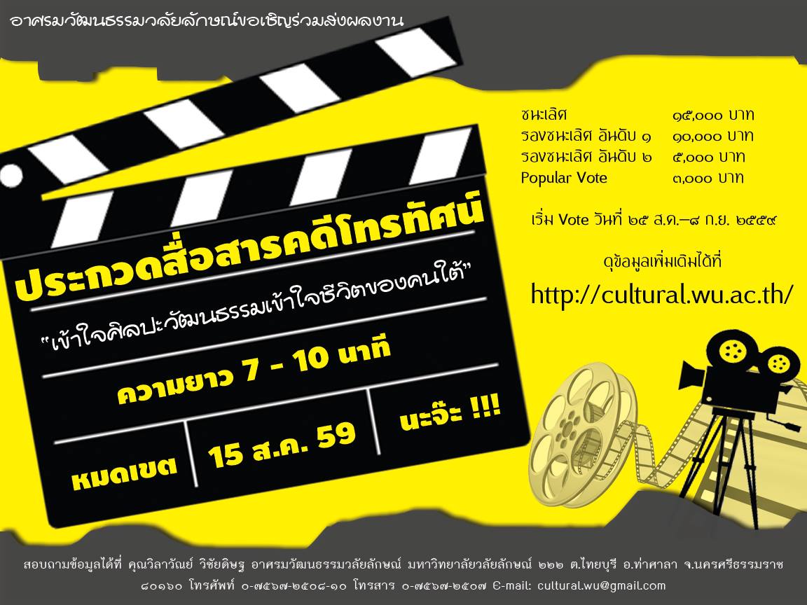 ขอเชิญประกวดสื่อสารคดีโทรทัศน์ ภายใต้หัวข้อ “เข้าใจศิลปวัฒนธรรมเข้าใจชีวิตของคนใต้” อ่านต่อ » มิถุนายน 22, 2559